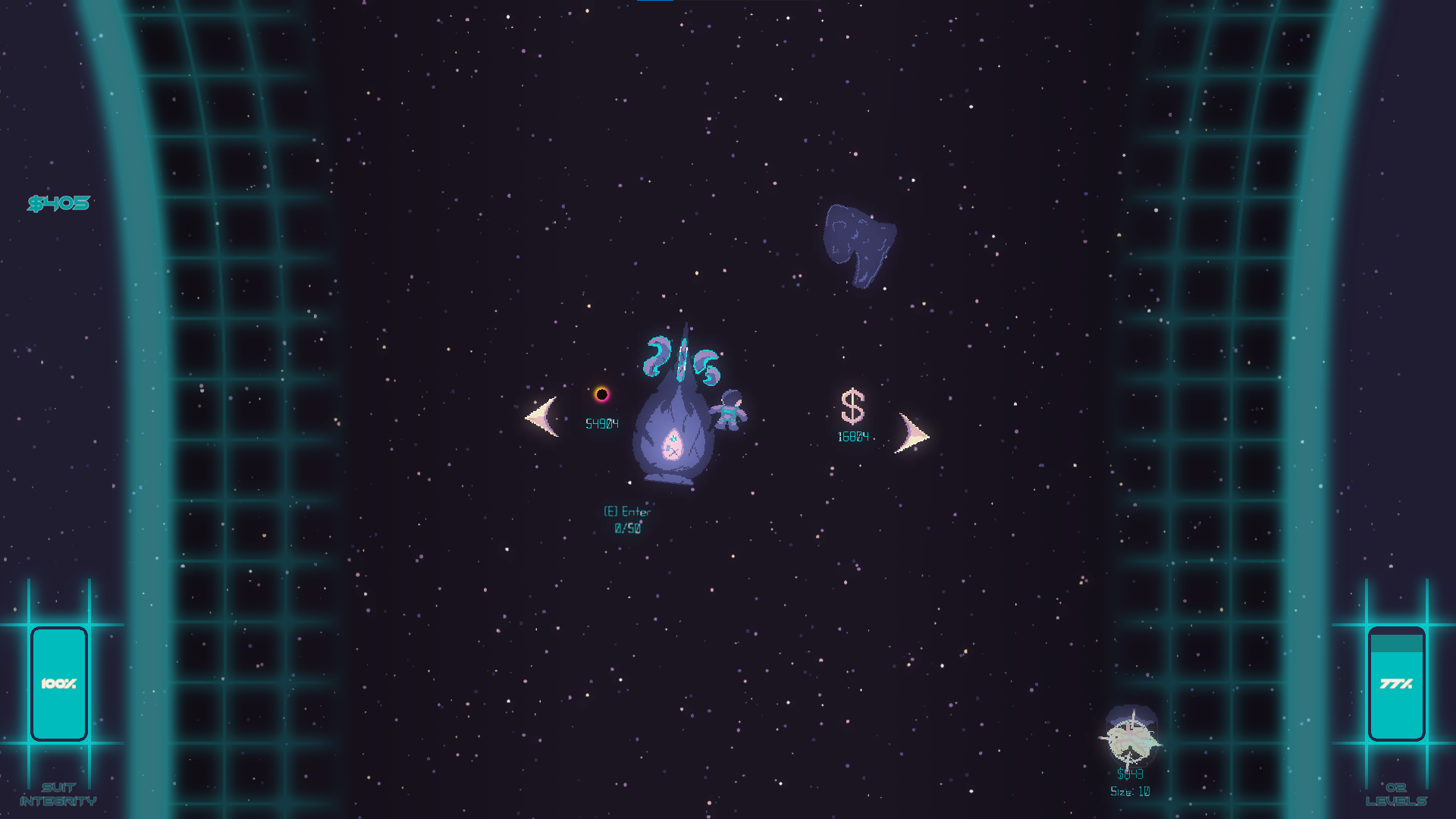 One day, you receive a distress call from near a black hole... Maybe whoever that was will have some valuable scrap to salvage! Collect and sell scrap, upgrade your ship and your suit, and try not to get pulled in by the black hole in the process... That's where the ships get destroyed, and that's where all the valuable scrap is. But be careful: there's a reason there's more scrap there.